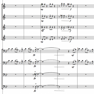 Each of the movements in the suite approach the combination of these ideas differently. Jump is influenced by the Kansas City style riff-based compositions. There are two motives (riffs) that are altered and combined in a classical manner. Jump also includes an improvised solo that requires the player to begin and end with a specific development of the. By contrast, Wail contains no improvised lines. Instead, this movement is developed from longer melodic ideas written to sound improvised. Bounce explores the rhythmic aspects of the jazz style through constantly shifting accents and uneven meters. Moan repeats a single melody three times, each time setting against different harmonies and orchestral textures. Finally, the suite is rounded out by Shout, a fanfare in a jazz style.